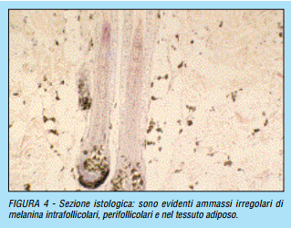 Chiaramente il punto della cuticola dove è localizzato il vacuolo è di minore resistenza ed è destinato alla frammentazione, con risultante formazione di buchi crateriformi, apprezzabili con la microscopia elettronica. La sola fragilità del pelo non è sufficiente a giustificare l’alopecia progressiva e le seguenti modificazioni follicolari. Miller ha proposto una teoria basata sul trasporto anormale del pigmento alla radice del pelo, con esposizione delle cellule della matrice del follicolo alla melanina e ai suoi precursori. Questi ultimi esercitando un effetto negativo di citotossicità indurranno sofferenza della matrice cellulare e displasia follicolare.