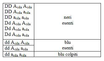 Prendendo in considerazione di soli accoppiamenti tra blu (dd), possiamo combinare i due fenotipi secondo tre possibilità: