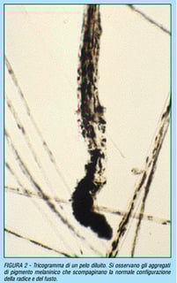 Da studi effettuati tramite il microscopio elettronico, risulta che a carico della cuticola del pelo diluito non ci sono deformità, se non in corrispondenza dei punti in cui sono localizzati gli aggregati di pigmento, dove troviamo un rigonfiamento della cuticola a cui corrisponde una vacuolizzazione riempita di aggregati di melanosomi, di varia forma e taglia, che rappresentano differenti stadi di maturazione del melanosoma (stadio II-III-IV) o differenti tipi di melanina .