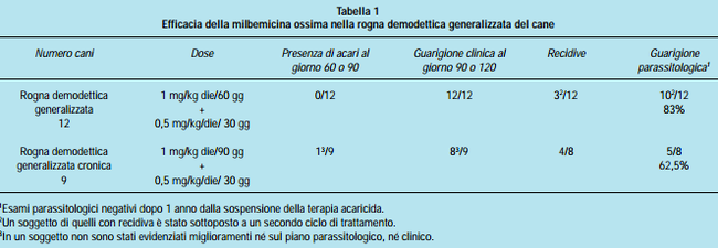 Sulla base di questi risultati, Miller et al. (1995) suggeriscono un dosaggio di 1 mg/kg di milbemicina mantenuto per ulteriori 30 giorni da quando i raschiati cutanei risultino negativi; nel caso in cui il numero di acari non diminuisca in modo significativo (almeno del 25%), il dosaggio va aumentato a 2 mg/kg. Nel corso di questi studi gli autori valutano anche l’efficacia del dosaggio di 2 mg/kg mantenuto fino a un massimo di 180 giorni. I risultati indicano una efficacia del 38% con il primo protocollo (0,5 mg/kg) e del 92% (12/13 cani) con la dose di 1-2 mg/kg dopo 60-180 giorni di trattamento.