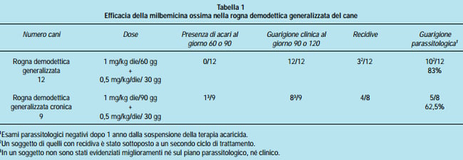 Nei cani adulti, un soggetto si è dimostrato refrattario al trattamento: acari vitali sono stati osservati nel corso degli esami parassitologici di controllo e i miglioramenti clinici sono stati del tutto trascurabili e transitori. Degli 8 rimanenti, 5 sono stati giudicati guariti sia sul piano parassitologico, sia sul piano clinico, mentre tre hanno presentato recidive dopo 15 giorni - 6 mesi dalla sospensione del trattamento con milbemicina ossima.